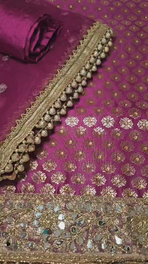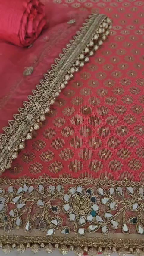 Unstitched suit comprising of a brocade kameez, raw silk salwaar material and a net dupatta